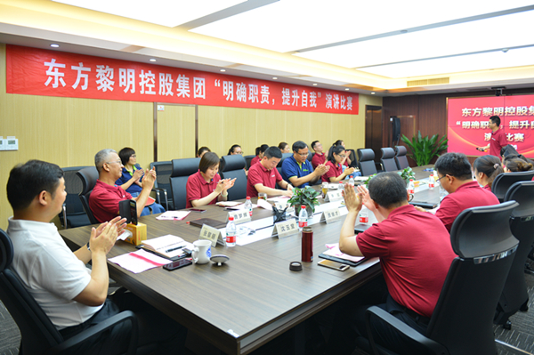 為貫徹董事長在年初動員大會上提出的“123”工程要求,在賈總和李總監倡導下,2019年6月30日下午,江蘇東方黎明國際貿易有限公司全體人員和江蘇福多美生物科技有限公司所有國際貿易業務人員齊聚一堂,在黎明大廈16樓會議室舉行了一場主題為“明確責任,提升自我”的演講比賽。
